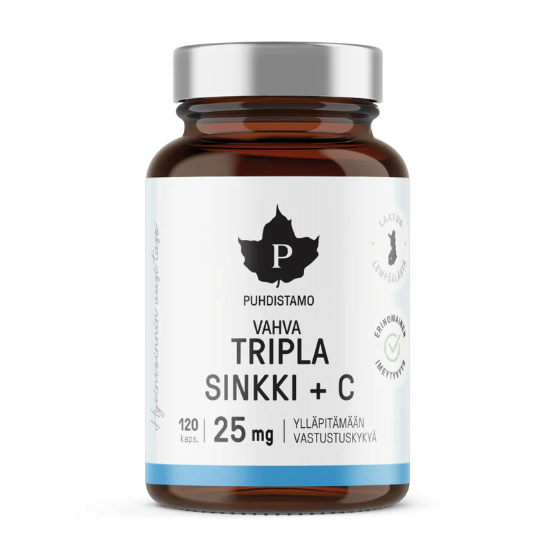 Low zinc levels can leave you feeling drained, lower your immune defense, and affect the condition of your skin, hair, and nails. Over time, even small deficiencies can impact your energy and recovery. Many zinc supplements fail to absorb properly, leaving your body without the support it needs. Synthetic fillers, single zinc forms, and poor formulation often lead to weak results and wasted effort. Puhdistamo Triple Zinc + C combines three bioavailable forms of zinc with vitamin C, amino acids, and active B6 for optimal absorption and effect. This clean, vegan formula provides complete daily support for your immunity, skin, and overall well-being — with no unnecessary additives or fillers.