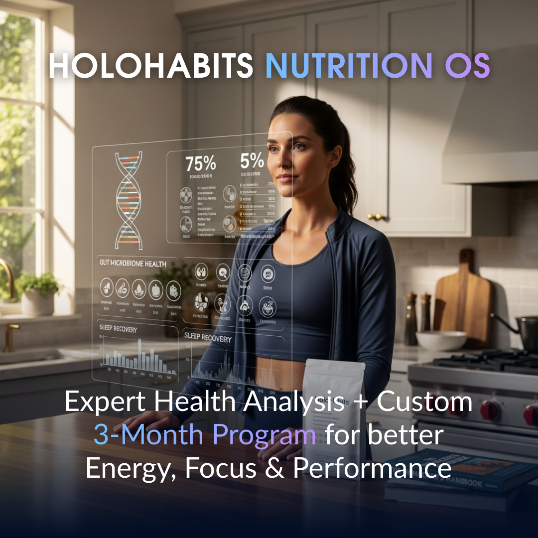 Bessere Energie, Konzentration und Erholung mit dem intelligentesten personalisierten Ernährungssystem der Welt. Verändern Sie Ihr Wohlbefinden mit Holohabits Nutrition OS, dem vollständigen KI-gestützten, testbasierten Ernährungssystem, dem Langlebigkeitsexperten und Biohacking-Profis vertrauen. Dieses 90-Tage-Programm wurde für schnelle und nachhaltige Ergebnisse entwickelt und hilft Ihnen, Müdigkeit, Hirnnebel, langsame Erholung oder unerklärliche Gewichtszunahme zu überwinden - ohne Tausende für die falschen Nahrungsergänzungsmittel zu verschwenden. In nur 14 Tagen werden Sie genau verstehen, was Ihr Körper braucht - von Omega-3- und Mineralstoffmangel bis hin zu hormonellen oder Aminosäure-Ungleichgewichten - und Sie erhalten einen Schritt-für-Schritt-Plan, um Ihre Energie, geistige Klarheit und allgemeine Vitalität wiederherzustellen. (Nächste Lieferung ab 6. Dezember. Bestellen Sie jetzt vor und profitieren Sie von einem begrenzten Einführungspreis). Nur für US-Bestellungen: Das vorausbezahlte Rücksendeetikett ist NICHT in Kits enthalten, die in die USA versandt werden (Details unten)