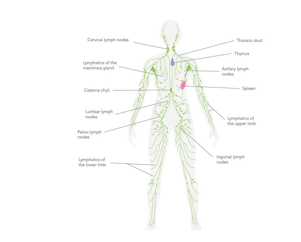 O timo é um órgão linfoide primário distinto do sistema imunitário. Encontra-se no mediastino superior anterior, posterior ao esterno e entre os pulmões. O timo é uma glândula lobular composta por dois lobos separados, mas interligados. Cada lóbulo está envolvido e subdividido num número significativo de lóbulos mais pequenos. Os lóbulos compreendem um córtex cheio de células T em desenvolvimento e uma medula com células T maduras.(1)