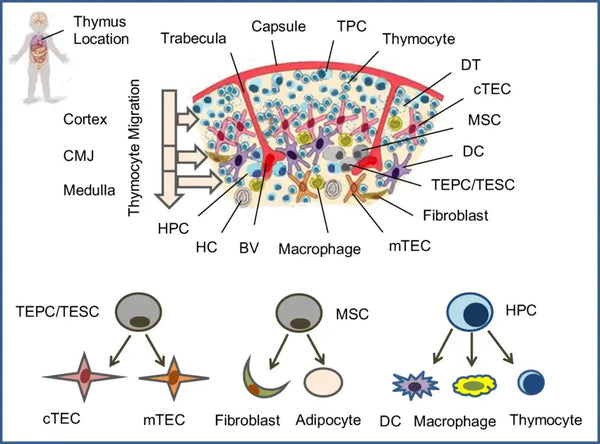 Um grupo de hormonas timosinas, em especial a timosina alfa-1, é essencial para a maturação dos linfócitos T.(4) A timosina alfa-1 melhora as actividades de determinadas células imunitárias, como as células dendríticas e as células assassinas naturais. Também influencia a diferenciação das células T e abrange uma gama mais vasta do que apenas o timo e as suas actividades que envolvem as células T nos tecidos periféricos e noutros órgãos linfóides. O potencial da timosina como agente terapêutico tem sido amplamente estudado, particularmente no tratamento de infecções crónicas em estados imunocomprometidos e como agente imunoestimulador na terapia do cancro.(5-6)